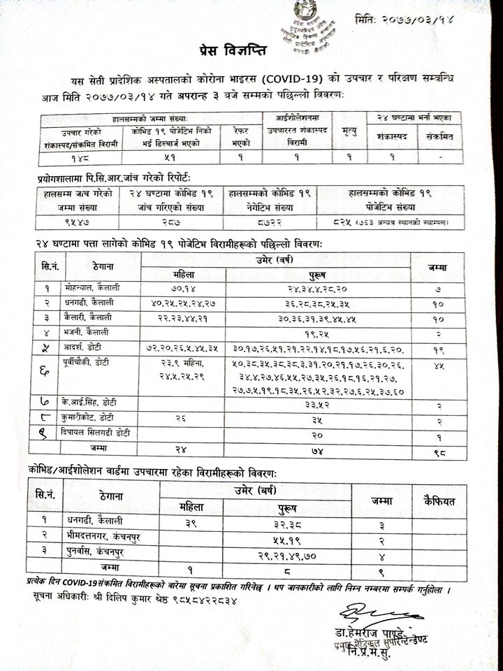 यस्तै डोटीको के.आइ.सिँह गाउँपालिकाका २ जना, कुमारीकोट, डोटीका २ जना र दिपायल सिलगढी नगरपालिकाका १ जना गरी जम्मा ९८ जनामा कोरोना पुष्टि भएको विज्ञप्तीमा उल्लेख गरिएको छ ।