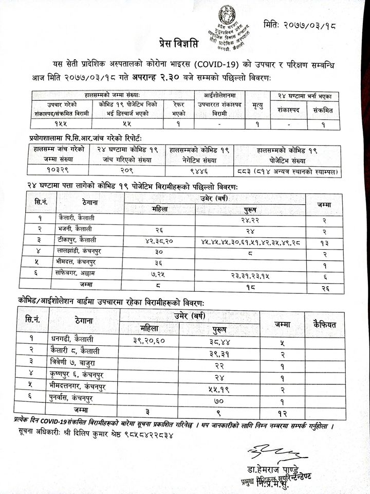 सेती प्रादेशिक अस्पतालले दिउँसो २ : ३० बजेसम्मको विवरण सार्वजनिक गरेको हो । जसमा कैलालीको टीकापुर नगरपालिकाका ३ महिला र १० पुरुष गरि १३ जनामा संक्रमण पुष्टि भएको छ भने भजनी नगरपालिकामा १ महिला र १ पुरुष गरि २ जनामा कोरोना पुष्टि भएको उल्लेख गरेको छ ।