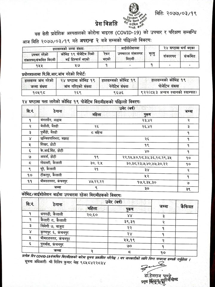 डोटीका १२ जना, कैलालीका १३ जना, कञ्चनपुरका ७ जना, बैतडीका ८ महिने शिशु सहित ४ जना, अछामका २ जना र बझाङका एक जना गरी ३० जनामा कोरोना पुष्टि भएको सेती प्रादेशिक अस्पतालले जनाएको छ ।