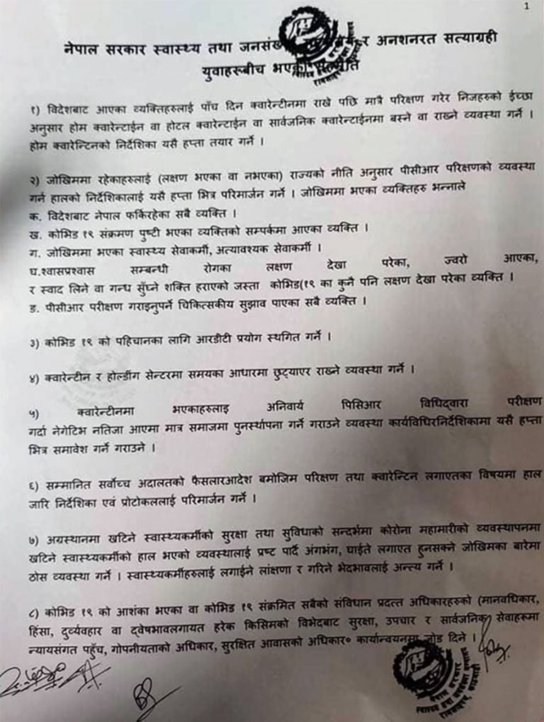 काठमाडौं – स्वास्थ्य तथा जनसङ्ख्या मन्त्रालय र अनशनरत सत्याग्रही युवाबीच सहमति भएको छ । मन्त्रालयका तर्फबाट वरिष्ठ विशषेज्ञ डा.रोशन पोखरेल र सहप्रवक्ता डा.समिरकुमार अधिकारी र सत्याग्रही युवाका तर्फबाट बिन्ज्वाला श्रेष्ठ र डा.सन्तोष पौडेलबीच १२ बुँदे सहमति भएको हो । सहमतिसँगै अनशनरत युवाले अनशन तोड्न छन् । सहमतिअनुसार कोभिड–१९ को पहिचानका लागि आरडिटी प्रयोग स्थगित गरी पिसिआर विधिमात्र प्रयोग गरिने छ ।