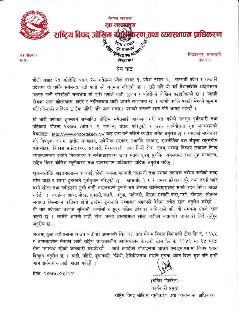 राष्ट्रिय विपद् जोखिम न्यूनीकरण तथा व्यवस्थापन प्राधिकरणका अनुसार असार २५ देखि २८ गतेसम्म प्रदेश १, २, बाग्मती र गण्डकी प्रदेशमा धेरै पानी पर्ने अनुमान गरिएको छ । वैशाखदेखि अहिलेसम्म प्रशस्त पानी परेको भन्दै प्राधिकरणले भनेको छ, ‘भारी वर्षाले बाढी, डुवान र पहिरोको जोखिम बढाइदिएको छ ।’
