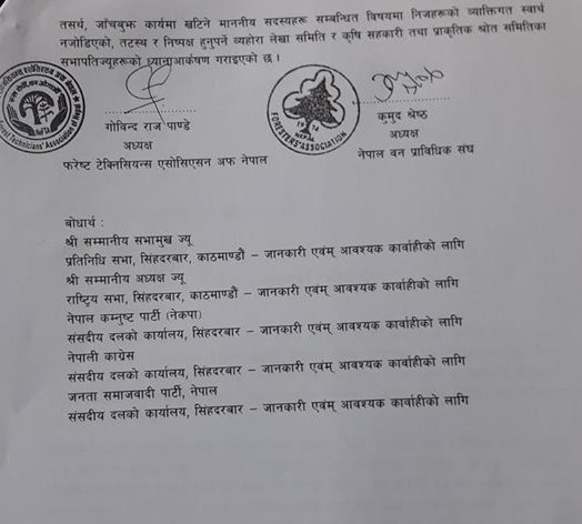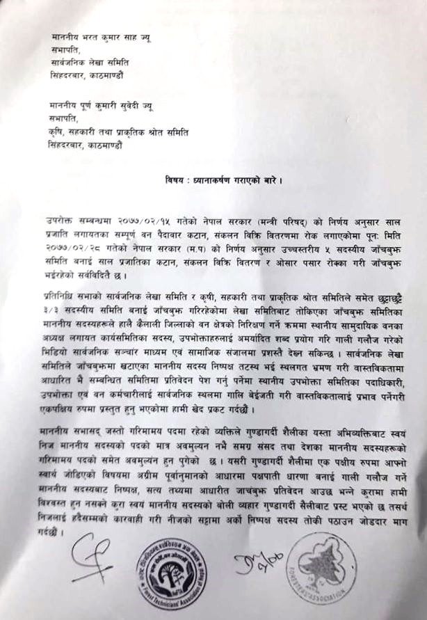 विहिवार एक विज्ञप्ती सार्वजनिक गर्दै फरेष्ट टेक्निसियन्स एसोसिएसन अफ नेपालका अध्यक्ष गोविन्दराज पाण्डे र नेपाल वन प्राविधिक संघका अध्यक्ष कुमुद श्रेष्ठले प्रतिनिधि सभाको सार्वजनिक लेखा समिति र कृषि, सहकारी तथा प्राकृतिक श्रोत समितिले समेत छुट्टाछुट्टै ३÷३ सदस्यीय समिति बनाई जाँचबुझ गरिरहेकोमा लेखा समितिबाट तोकिएका जाँचबुझ समितिका माननीय सदस्यहरुले हालै कैलाली जिल्लाको वन क्षेत्रको निरिक्षण गर्ने क्रममा स्थानीय सामुदायिक वनका अध्यक्ष लगायत कार्यसमितका सदस्य, उपभोक्ताहरुलाई अमर्यादित शब्द प्रयोग गरि गाली गलौज गरेको भिडियो सार्वजनिक सञ्चार माध्यम एवं सामाजिक संजालमा प्रशस्तै रहेको उल्लेख गरेको छ ।
