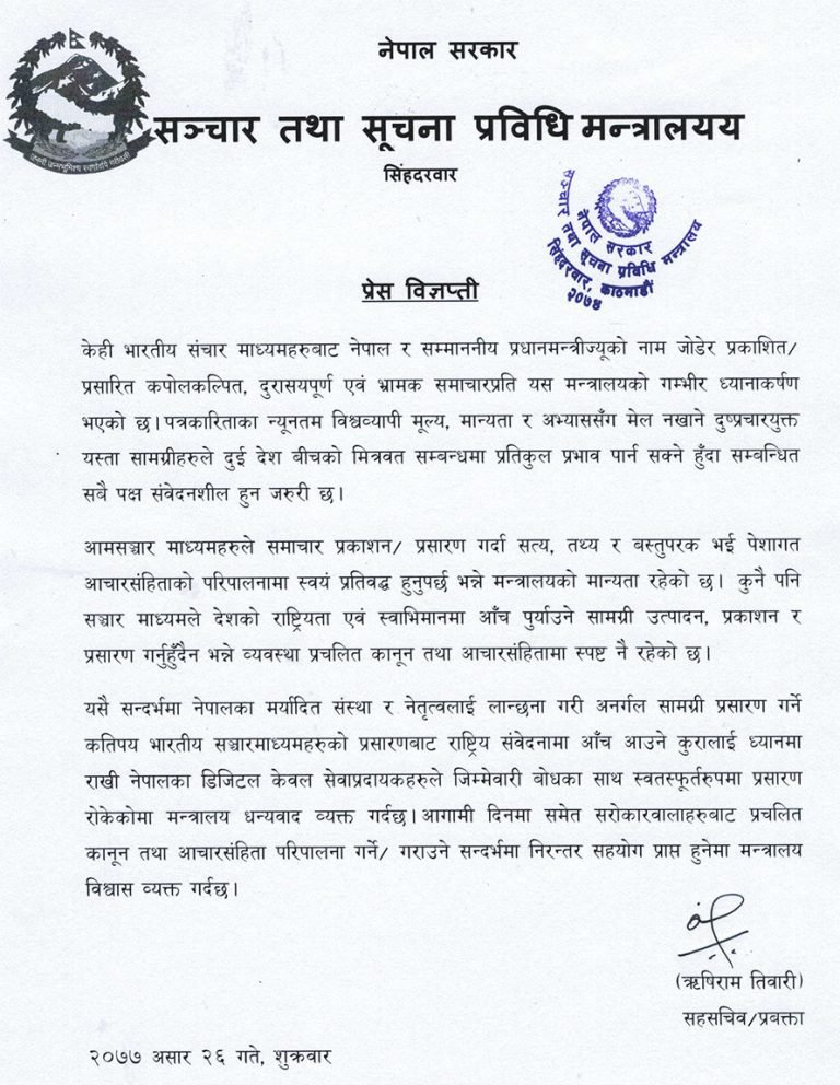 शुक्रबार विज्ञप्ति निकालेर मन्त्रालयले भनेको छ ‘नेपालका मर्यादित संस्था र नेतृत्वलाई लाञ्छना गरी अनर्गल सामग्री प्रसारण गर्ने कतिपय भारतीय सञ्चारमाध्यमहरूको प्रसारणबाट राष्ट्रिय संवेदनामा आँच आउने कुरालाई ध्यानमा राखी नेपालका डिजिटल केवल सेवाप्रदायकहरूले जिम्मेवारी बोधका साथ स्वतस्फूर्त रूपमा प्रसारण रोकेकोमा मन्त्रालय धन्यवाद व्यक्त गर्दछ।’