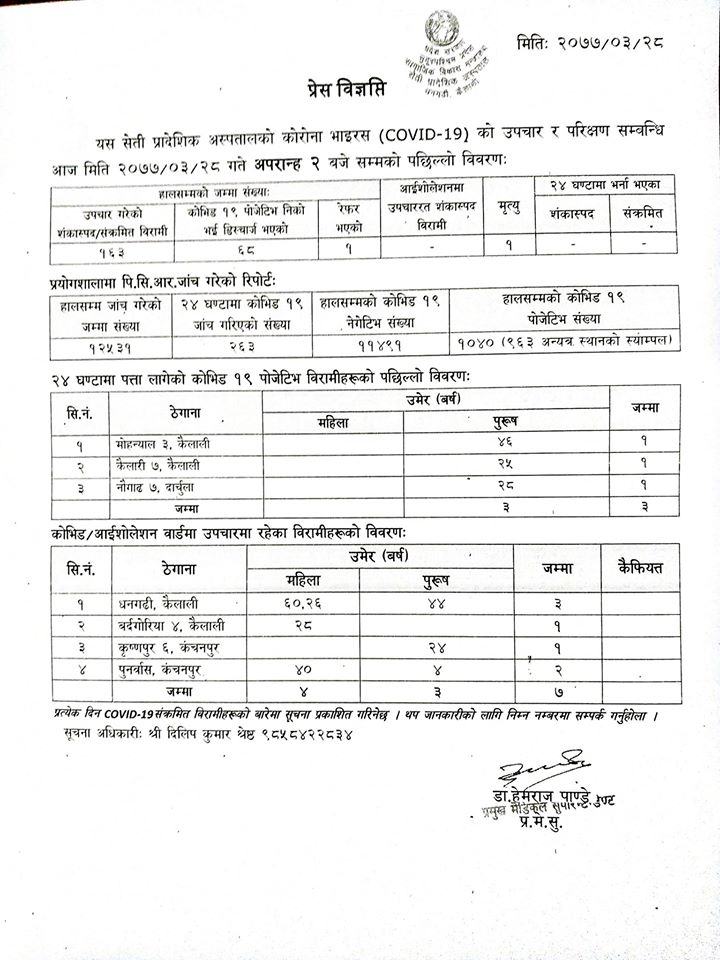सेती प्रादेशिक अस्पतालमा गरिएएको परीक्षणमा नौगाडा गाउँपालिकाका २८ वर्षिया पुरुषमा कोरोना पुष्टि भएको हो । यस्तै सेती प्रादेशिक अस्पतालमा गरिएको परीक्षणमा कैलालीका ४६ र २५ वर्षिया पुरुषमा पनि कोरोना संक्रमण पुष्टि भएको अस्पतालले जनाएको छ ।