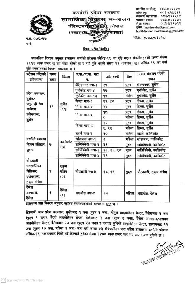 काठमाडौँ – कर्णाली प्रदेशमा थप २१ जनामा कोरोना संक्रमण पुष्टि भएको छ । प्रदेश अस्पताल सुर्खेत र पशुपन्छी रोग अन्वेषण प्रयोगशाला, सर्खेतमा गरिएको परीक्षणमा सुर्खेतका ११ जनामा कोरोना पुष्टि भएको सामाजिक विकास मन्त्रालय अन्तरगतको स्वास्थ्य शाखाले जनाएको छ । त्यस्तै कर्णाली स्वास्थ्य विज्ञान प्रतिस्ठान, जुम्लामा गरिएको परीक्षणमा कालिकोटका ७ जनामा कोरोना पुष्टि भएको हो ।