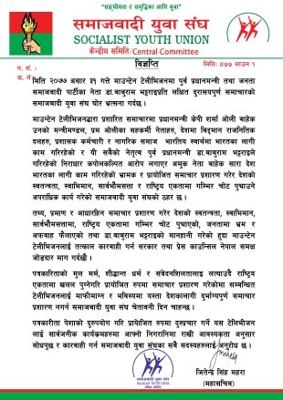 गत असार ३१ गते माउन्टेन टेलिभिजनद्वारा प्रशारित समाचारमा प्रधानमन्त्री केपी शर्मा ओली बाहेक उनको मन्त्रीमण्डल, प्रम ओलीका सहकर्मी नेताहरु, देशमा विद्दमान राजनीतिक दलहरु, प्रशासक कर्मचारी र नागरिक समाज भारतीय स्वार्थमा भारतका लागि काम गरिरहेको र यी सबैको नेतृत्व पूर्व प्रधानमन्त्री डा. भट्टराइले गरिरहेको निराधार कपोलकल्पित आरोप लगाएर अमुक नेता बाहेक सारा देश भारतका लागि काम गरिरहेको भ्रामक र प्रायोजित समाचार प्रशारण गरेर देशको स्वतन्त्रता, स्वाभिमान, सार्वभौमतता र राष्ट्रिय एकतामा गम्भिर चोट पु¥याउने अपराधिक कार्य गरेको समाजवादी युवा संघको ठहर छ ।