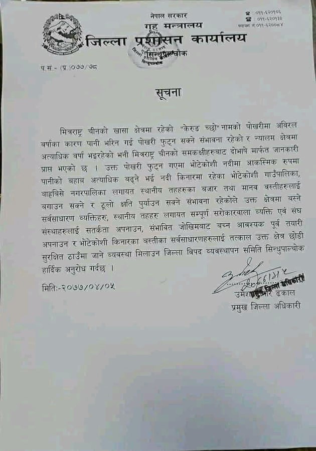 जिल्ला प्रशासन कार्यालय सिन्धुपाल्चोकले सोमबार साँझ सूचना जारी गर्दै सुरक्षा सतर्कता उपनाउन तल्लो तटीय क्षेत्रका बासिन्दालाई आग्रह गरेको छ । ‘खासा क्षेत्रमा रहेको केरुङ छ्यो ताल फुट्ने खतरा बढेको छ,’ चिनियाँ समकक्षीलाई उद्धृत गर्दै प्रमुख जिल्ला अधिकारी उमेशकुमार ढकालले सोही सूचनाका आधारमा तल्लो तटीय क्षेत्रमा उच्च सतर्कता अपनाउँन अपिल गरेको बताए ।