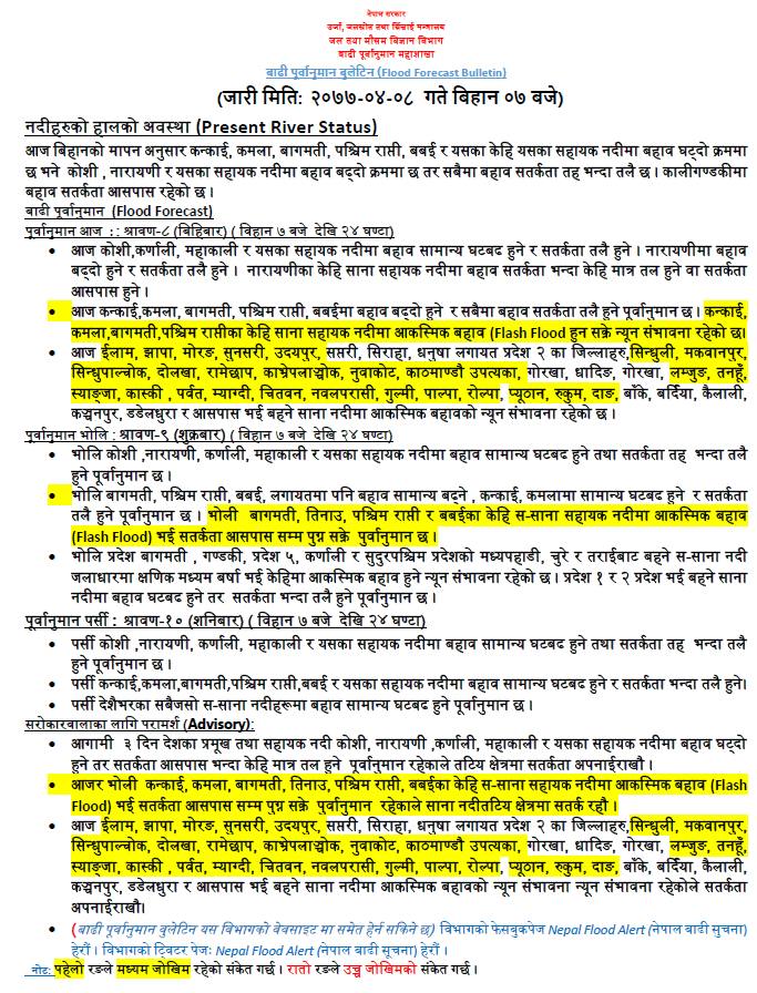 आज नारायणी र यसका केहि सहायक नदीमा बहाव केहि बढ्ने तथा अन्य सबै प्रमुख र मझौला नदीमा बहाव केहि घटबढ हुने महाशाखाको पूर्वानुमान छ । आज र भोलि कन्काई, बागमती, तिनाउ, पश्चिम राप्ती, बबईका केहि सहायक नदीमा आकस्मिक बहाव हुन सक्ने सम्भावना न्यून रहको छ ।