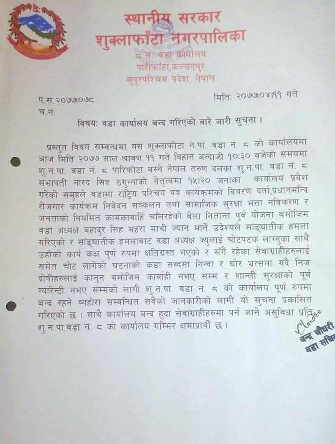 वडा अध्यक्षमाथि सांघातिक आक्रमण, वडा कार्यालय अनिश्चितकालका लागि बन्द