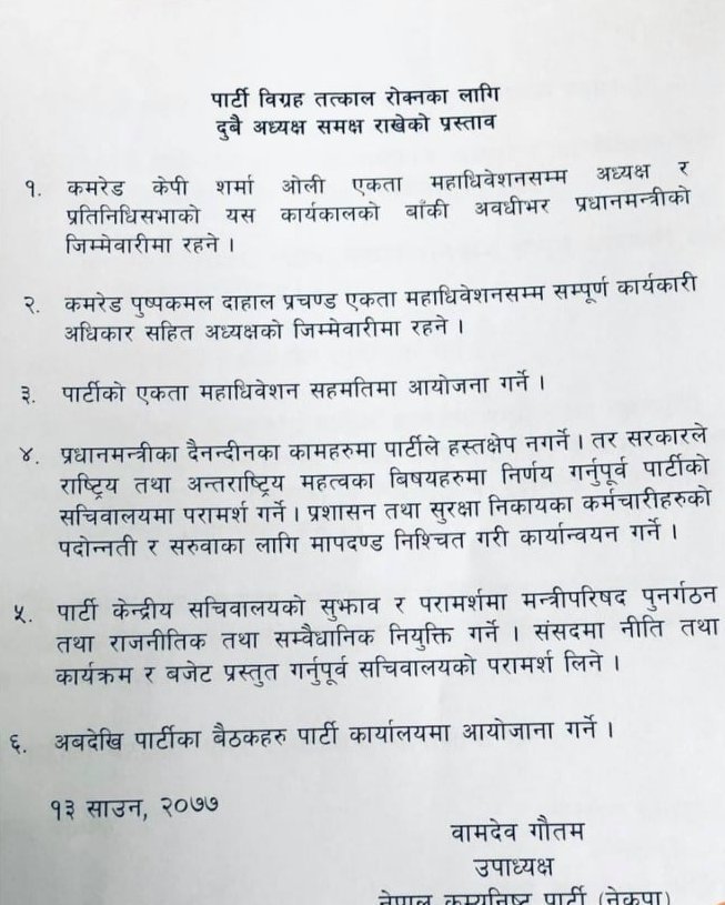 काठमाडौं – नेपाल कम्युनिस्ट पार्टी (नेकपा) भित्र विवाद चर्किएको छ । विवादले उग्र रुप लिएका बेला उपाध्यक्ष बामदेव गौतमले ६ बुँदे प्रस्ताव अघि सारेका छन् । पार्टी विग्रह तत्काल रोक्नका लागि भन्दै अध्यक्षद्वय केपी शर्मा ओली र प्रचण्डसामु गौतमले ६ बुँदे प्रस्ताव अघि सारेका हुन् ।