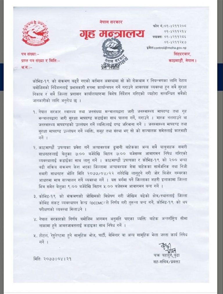 मंगलबार प्रधानमन्त्री केपी शर्मा ओलीले गरेको छलफलमा पनि विज्ञहरुले पूर्ण लकडाउन गर्नुको साटो स्वास्थ्य मापदण्डमा कडाई गर्न र जोरविजोर लगाउन सुझाएका थिए । सरकारले भोलिदेखि राति ९ बजेदेखि विहान ५ बजेसम्म हिँडडुलमा पनि रोक लगाएको छ ।