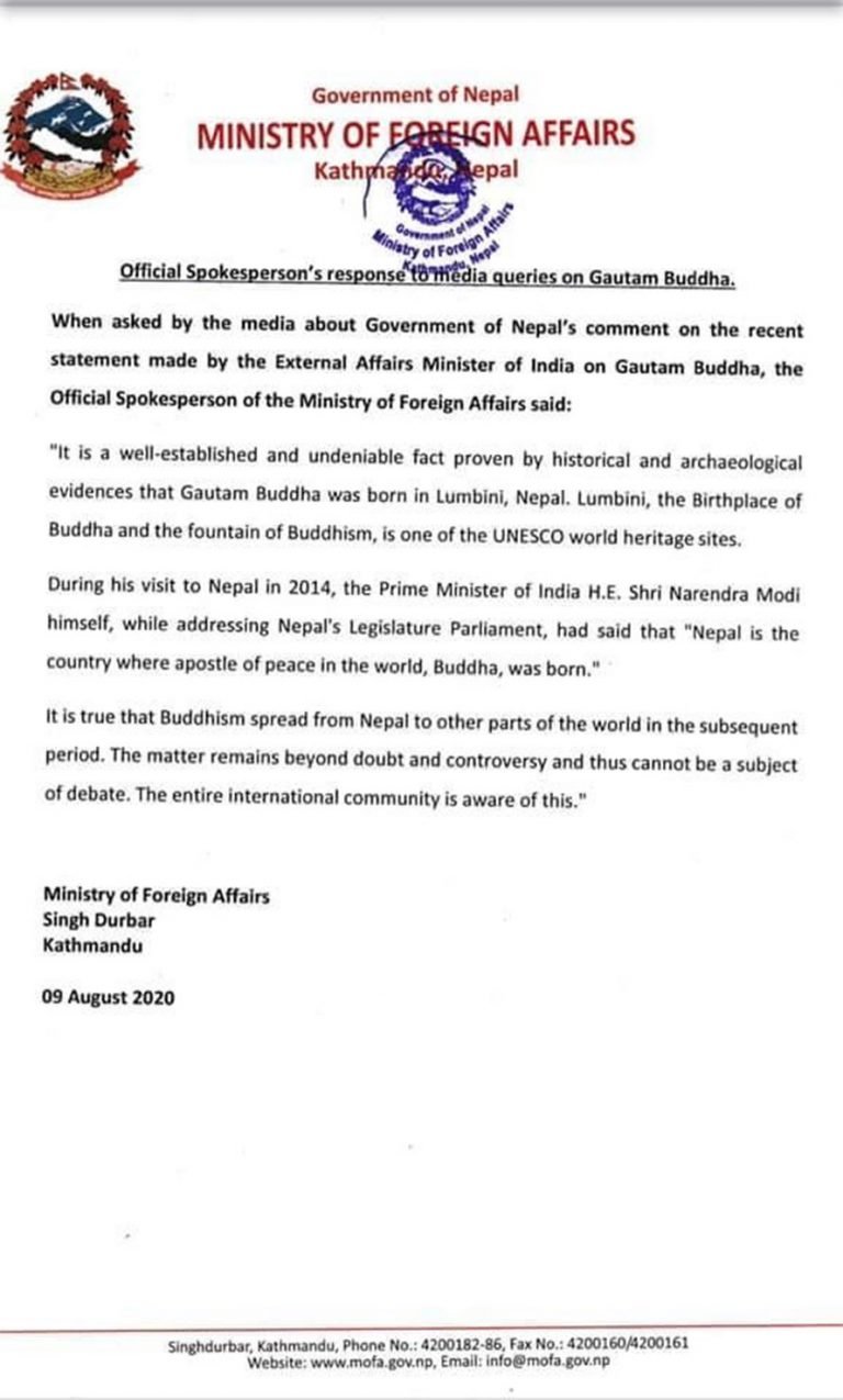 सञ्चारकर्मीको प्रश्नमा परराष्ट्र मन्त्रालयका प्रवक्ता भरतराज पौडेलले भनेका छन्, ‘यो ऐतिहासिक र पुरातात्विक प्रमाणहरुद्वारा पूर्णरुपमा स्थापित र अकाट्य तथ्य हो कि भगवान बुद्ध नेपालको लुम्बिनीमा जन्मनुभएको थियो । बुद्धको जन्मस्थल तथा बुद्धधर्मको प्रादुर्भाव लुम्बिनी युनेस्कोको विश्व सम्पदास्थलमा समेत रहेको छ ।’