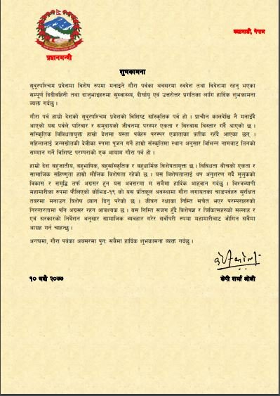 प्रधानमन्त्री ओलीले शुभकामना वक्तव्यमा प्राचीन कालदेखि नै मनाइँदै आएको गौरा पर्वले परिवार र समुदायको जीवनमा परस्पर एकता र विश्वास विस्तार गर्दै आएको उल्लेख गर्नुभएको छ ।