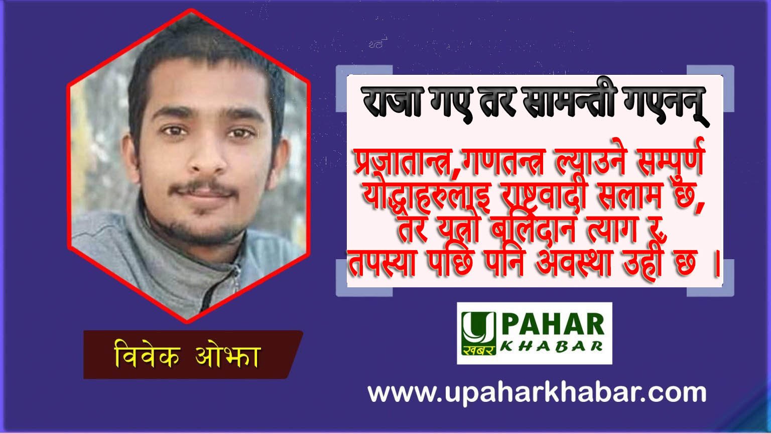 एकलौटी शासन सत्ता हातमा लिएर राजाले जनताहरुलाइ दुख दिदै आइरहेका थिए। पुस्तौ पुस्ता शासन चलाए।बिस्तारै जनचेतना जाग्यो र कोहि उछिल्किएर मैदानमा उतृए र प्रजातन्त्रको खम्बा गाडे। र केही हद सम्म जनताहरु जागृत भए सामन्तिहरुका विरुद्ध बन्दुक बोक्न बाध्य भए र देशमा गणतन्त्र पनि आयो । प्रजातान्त्र,गणतन्त्र ल्याउने सम्पुर्ण योद्धाहरुलाइ राष्ट्रवादी सलाम छ। तर यत्रो बलिदान, त्याग र तपस्या पछि पनि अवस्था उहीँ छ । आखिर गणतन्त्र गणतन्त्र ल्याउनेहरुका लागि मात्रै नभइ सम्पुर्ण नेपाली जनताको लागि थियो तर यहाँ त्यसो भएन म प्रयोग भए मेरो साथी भयो हामी अधिकार र न्यायको लागि सडकमा टायर बाल्छौ उ मज्जाले आफ्नो सत्ता बचाउन स्वार्थ पुर्ती गर्दै जान्छ ।