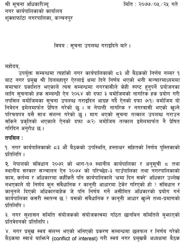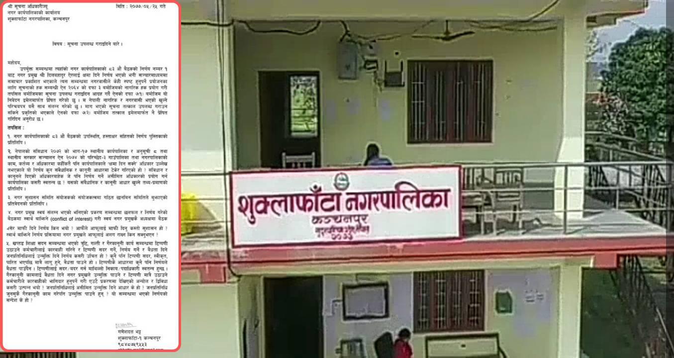 कंचनपुर- शुक्लाफाँटा नगर कार्यपालिकाको ८३ औँ बैठकले नगर प्रमुख दिलबहादुर ऐरलाइ क्षमा दिने निर्णय गरेपछि नगरबासी असन्तुष्ट बनेका छन् । कार्यपालिकाको बैठकले खप्तड शिक्षा सदन अन्यत्र सारिने विषयमा भएको प्रक्रियागत त्रुटिका दोषी नगर प्रमुखलाइ क्षमा दिने निर्णय गरेको थियो ।