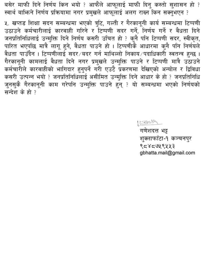 नेपालको संविधान २०७२ को भाग -१७ स्थानीय कार्यपालिका र अनुसूची ८ तथा स्थानीय सरकार सन्चालन ऐन २०७४ को परिच्छेद -३ गाउँपालिका तथा नगरपालिकाको काम, कर्तव्य र अधिकारमा कहिँ कतै पनि कार्यपालिकाले क्षमा दिन सक्ने अधिकार उल्लेख नभएकोले यो निर्णय असंवैधानिक र गैरकानुनी भएको नगरबासीको जिकिर छ ।
