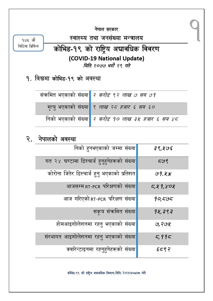 देशभरका प्रयोगशालामा १०८७८ जनाको पीसीआर परीक्षण गर्दा ११७० जनामा कोरोना भाइरस संक्रमण पुष्टि भएको स्वास्थ्य तथा जनसंख्या मन्त्रालयको नियमित प्रेस ब्रिफिङमा सोमबार प्रवक्ता प्रा.डा. जागेश्वर गौतमले जानकारी दिनुभयो । बितेको २४ घण्टामा ८७९ जना डिस्चार्ज भएका छन् । अहिलेसम्म डिस्चार्ज हुनेको संख्या ३९५७६ रहेको छ । संक्रमितमध्ये ७१.५ प्रतिशत भएका छन् ।