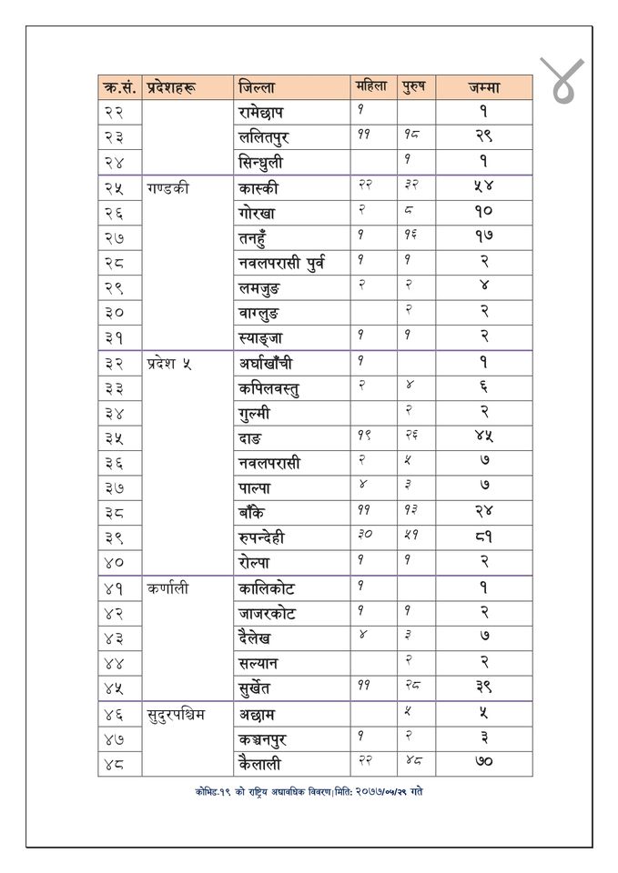 काठमाडौंमा ४४०, भक्तपुरमा ४३ र ललितपुरमा २९ जनामा संक्रमण पुष्टि भएको स्वास्थ्य तथा जनसंख्या मन्त्रालयले जनाएको छ ।