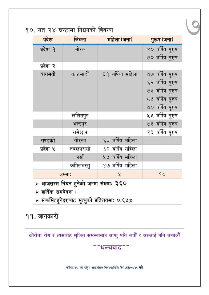 बितेको २४ घण्टामा १०,८७८ जनाको पीसीआर भएको छ भने हालसम्म कुल ८ लाख ५१ हजार ४०५ जनाको पीसीआर भएको छ ।यस्तै पछिल्लो २४ घण्टामा १५ जनाको मृत्यु भएसँगै मृतकको कुल संख्या ३६० पुगेको मन्त्रालयले जनाएको छ ।