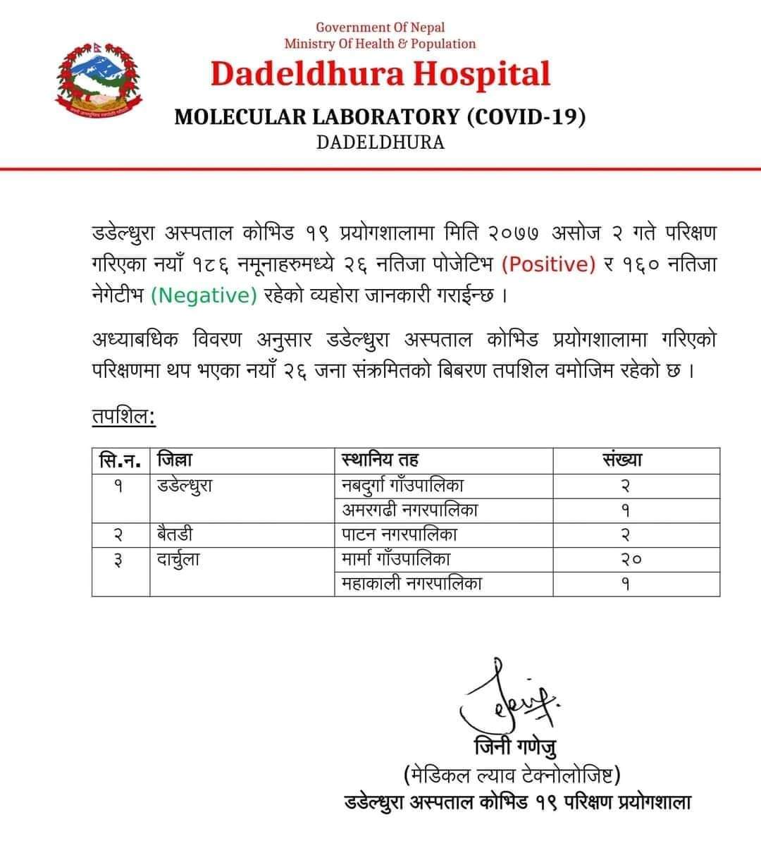 उपहार खबर संवाददाता – दार्चुलाका थप २१ जनामा कोरोना संक्रमण पुष्टि भएको छ । शनिवार डडेल्धुरा अस्पताल प्रयोगशालामा गरिएको परीक्षणमा दार्चुलाको मार्मा गाउँपालिकाका २० जना र महाकाली नगरपालिकाका १ जना गरि २१ जनामा कोरोना पुष्टि भएको हो । यसैगरी डडेल्धुराका ३ जना र बैतडीका २ जनामा समेत कोरोना पुष्टि भएको मेडिकल ल्याव टेक्नोलोजीष्ट जिनी गणेजुले जानकारी दिए ।