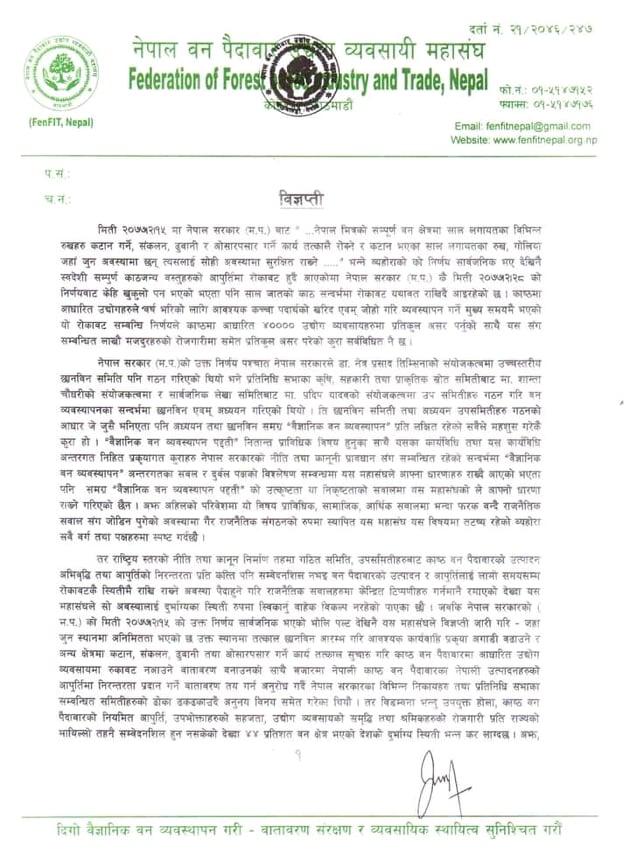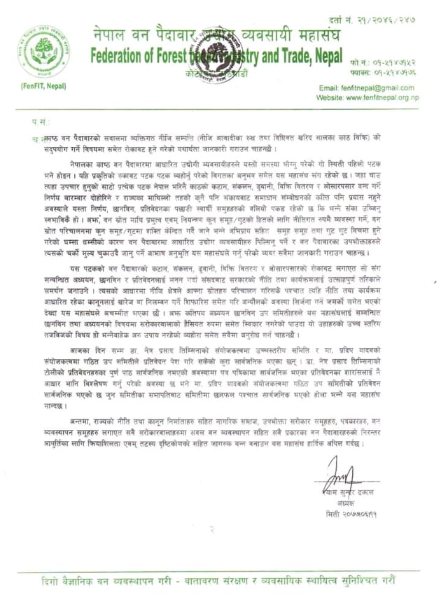 यसैगरी नेपाल वन प्रदावार उद्योग व्यवसायी महासंघले मिति २०७७ साल जेठ १५ मा नेपाल सरकार मन्त्रिपरिषद् बैठकबाट नेपाल भित्रको सम्पूर्र्ण वन क्षेत्रमा साल लगायतका विभिन्न रुखहकटान गर्ने, संकलन, ढुवानी र ओसारपसार गर्ने कार्य तत्कालै रोक्ने र कटान भएका साल लगायतका रुख, गोलिया जहाँ जुन अवस्थामा छन त्यसलाई सोही अवस्थामा सुरक्षित राख्ने भन्ने व्यहोराको निर्णय सार्वजनिक भए देखिनै स्वदेशी सम्पूण काठजन्य वस्तुहरुको आपूर्तिमा रोकावट हुदै आएकोमा जेठ २८ गतेको मन्त्रिपरिषद् निर्णयबाट केहि खुकुलो पन भएको भएतापनि साल जातको काठ सन्दर्भमा रोकावट यथावत राखिदै आइरहेकोले काष्ठमा आधारित उद्योगहरुले बर्ष भरिको लागि आवश्यक कच्चा पदार्थको खरिद एव्म जोहो गरि गरि व्यवस्थापन गर्ने मुख्य समयमै भएको यो रोकावट सम्बन्धि निर्णले काष्ठमा आधारित ४० हजार उद्योग व्यवसायहरुमा प्रतिकुल असर पर्नुको साथै यस सँग सम्बन्धि लाखौँ मजदुहरुको रोजगारीमा समेत प्रतिकुल असर परेको प्रष्ट पारेको छ ।
