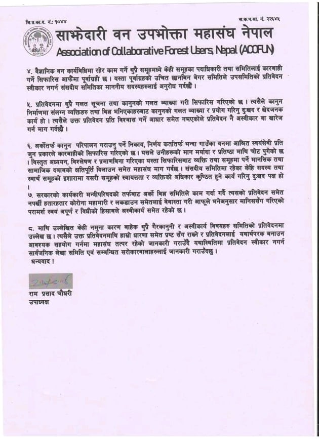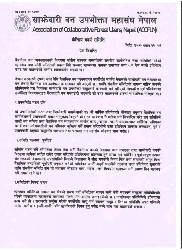 बैज्ञानिक वन व्यवस्थापनको विषयमा संघीय सरकार अन्तर्गतको संसदीय सार्वजनिक लेखा समितिले गरेको छानवीन तथा सोही समितिको हवला दिदै सञ्चार माध्यममा आएका समाचार तथा ८४ पेज लामो प्रतिवेदन माथि साझेदारी वन उपभोक्ता महासंघ नेपालले आपत्ती जनाएको छ ।