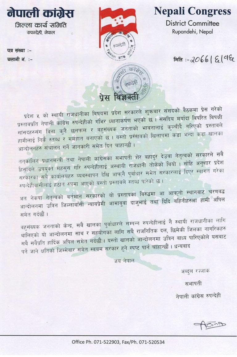 पार्टीका जिल्ला सभापति अब्दुल रज्जाकले शुक्रबार विज्ञप्ति जारी गर्दै कठोर आन्दोलनमा उत्रिएको उल्लेख गरेका छन् । तत्कालीन शेरबहादुर देउवा नेतृत्वको सरकारले रुपन्देहीलाई अस्थायी राजधानी तोकेको भन्दै स्थायी राजधानी सार्न नदिन सडक र सदन तताउने उनले बताएका छन् ।