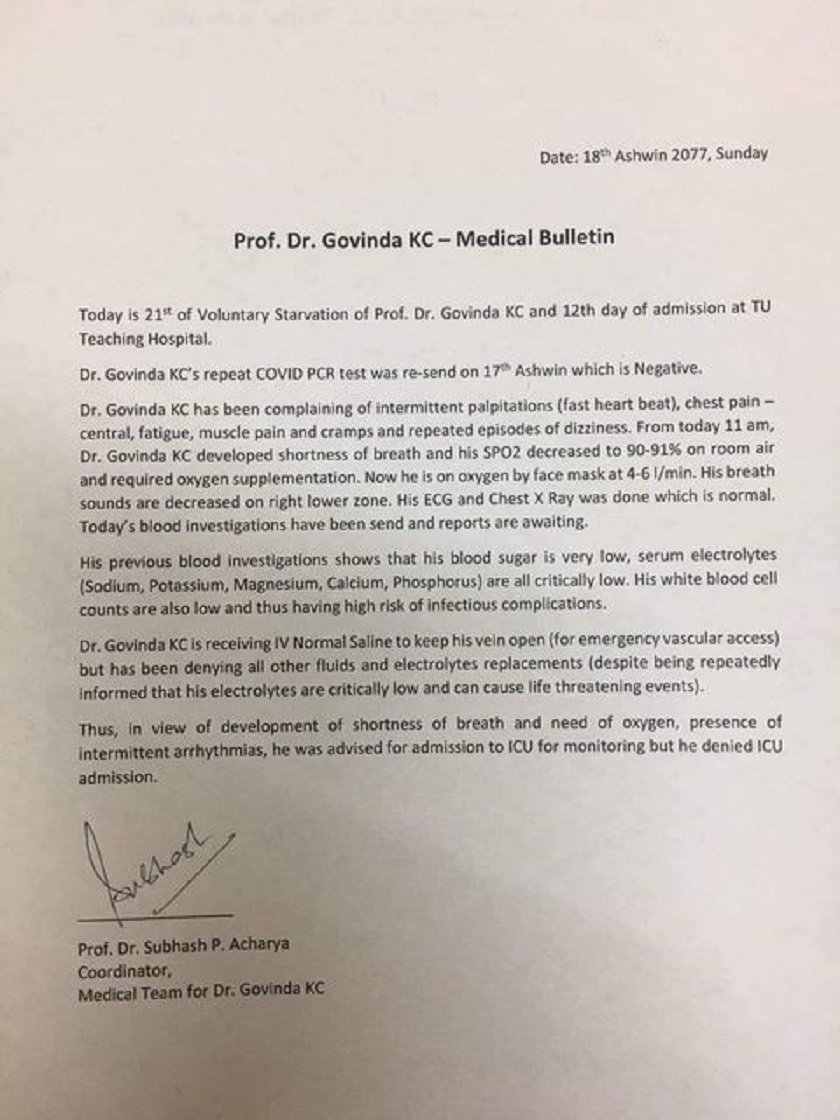 त्यसैगरी डा केसीको रगतमा डब्लुबिसीको मात्रा निकै कम भएको र सुगरको मात्रा पनि कम भएको जनाइएको छ । अस्पतालले डा.केसीको अवस्था थप नाजुक हुँदै गएको जे पनि हुनसक्ने चेतावनी दिएको छ । स्वास्थ्यअवस्था निकै नाजुक हुँदै गएपनि डा. केसीले आफ्ना मागहरु पुरा नभएसम्म उपचार गर्न इन्कार गर्दै आएका छन् । केही दिनअघि जुम्लाबाट काठमाडौं आएका डा.केसीले सुरुमा प्रहरीले ट्रामा सेन्टरमा पुर्याएको थियो । डा.केसीले ट्रमा सेन्टरमा नबस्ने अडान लिएपछि उनलाई त्रिवि शिक्षण अस्पताल पुर्याइएको थियो ।