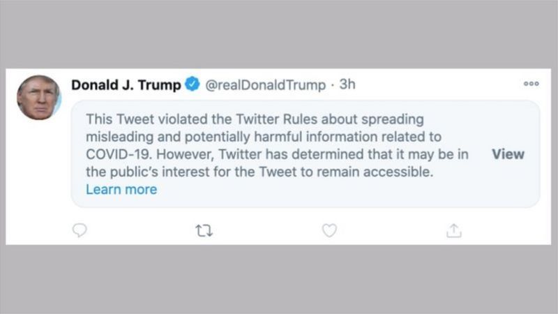 ट्रम्पले ट्वीटरमा पनि यो सन्देश राखेका थिए । यसलाई ट्वीटरले लुकाइदिएको छ । उनको यो ट्वीटमा एउटा चेतावनी लेखिएको देखिएको छ जसमा यो भ्रामक र सम्भावित रुपमा हानिकार जानकारीयुक्त सन्देश बताइएको छ ।