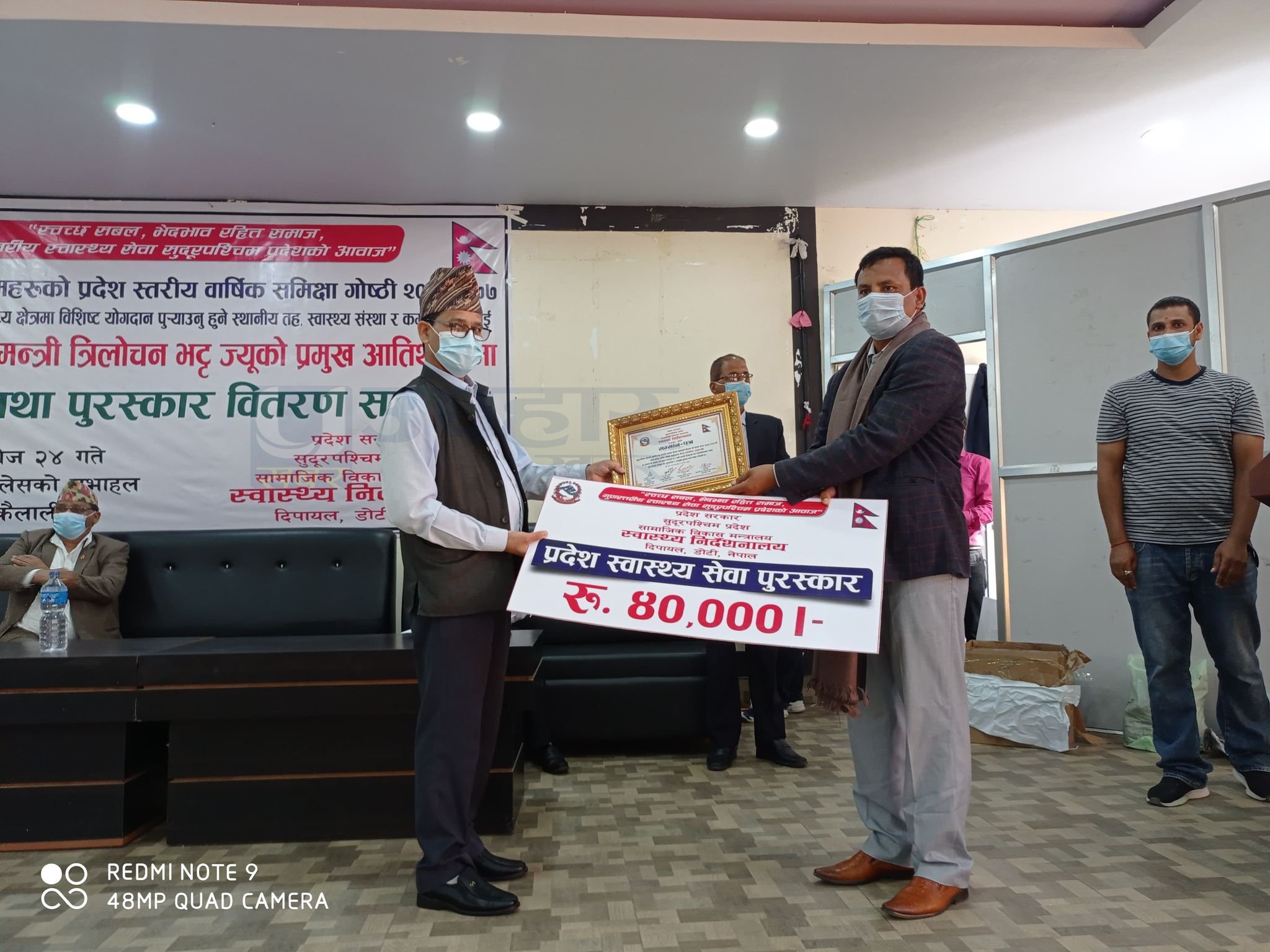 स्वच्छ, सबल, भेदभाव रहित समाज, गुणस्तरीय स्वास्थ्य सेवा सुदूरपश्चिम प्रदेशको आवाज भन्ने नाराका साथ सुदूरपश्चिम प्रदेशको स्वास्थ्य कार्यक्रमहरुको प्रदेश स्तरीय बार्षिक समिक्षा गोष्ठि २०७७ सम्पन्न भएको छ । सुदूरपश्चिम प्रदेशको स्वास्थ्य क्षेत्रमा विशिष्ट योगदान पुर्याउनु हुने स्थानीय तह स्वास्थ्य संस्था र कर्मचारीहरुलाई मुख्यमन्त्री त्रिलोचन भट्टको प्रमुख आतिथ्यतामा सम्मान तथा पुरस्कार वितरण गरिएको छ ।