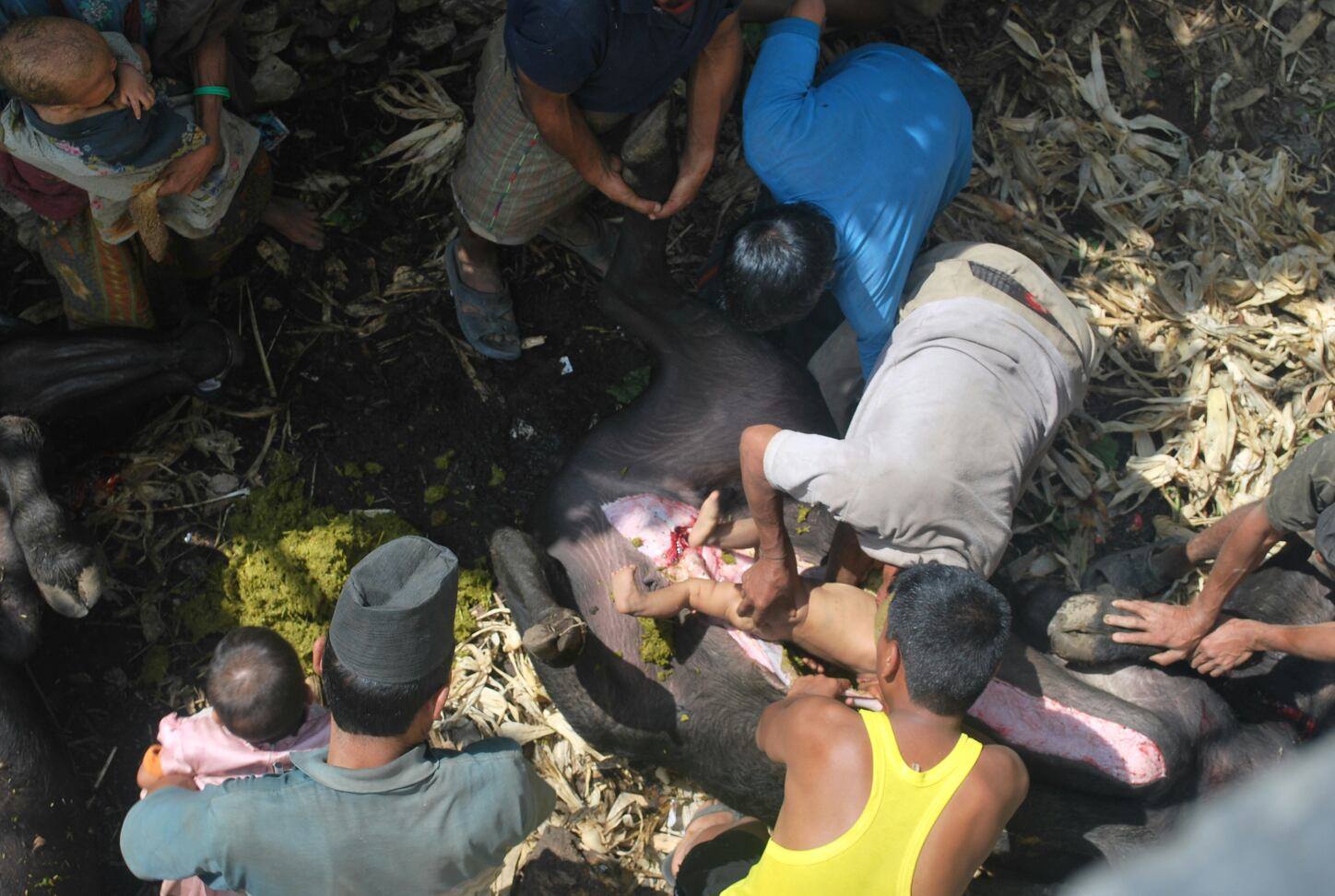 दशैंमा राँगा काटेपछि पेटबाट अलिकति लादी निकालेर केही समयका लागि बच्चालाई भित्र छिराएर हल्लाउने गरिन्छ । यसरी बच्चालाई राँगाको पेट भित्र छिराएर निकालेपछि रोग निको हुने विश्वास गाउँलेहरुको छ ।