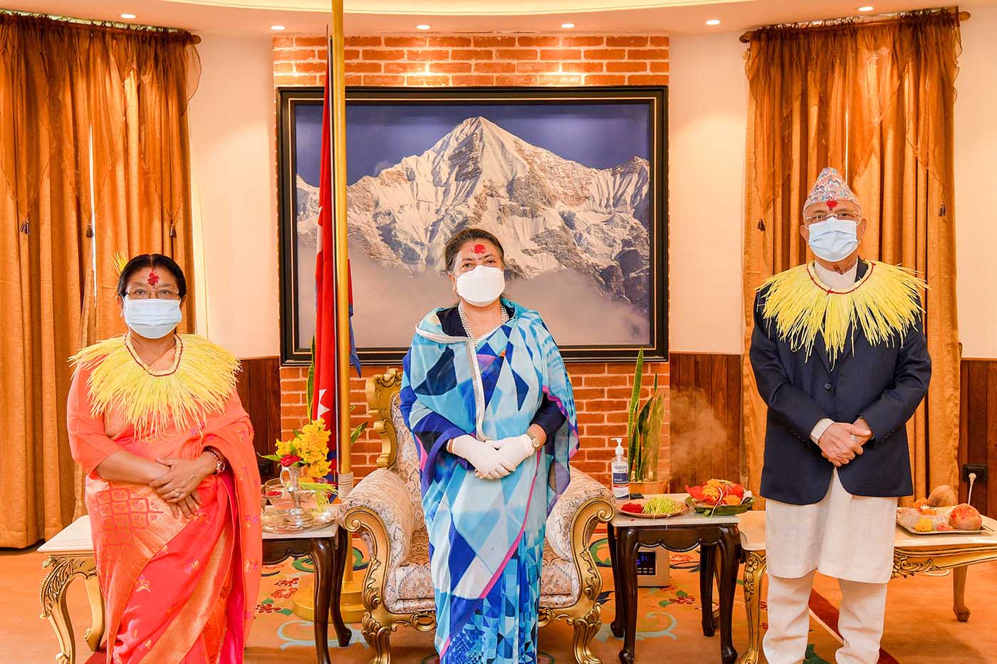 राष्ट्रपति भवन शीतल निवास पुगेर प्रधानमन्त्री ओली र पत्नी राधिका शाक्यले राष्ट्रपतिको हातबाट टीका र जमरा ग्रहण गर्नुभएको हो ।
