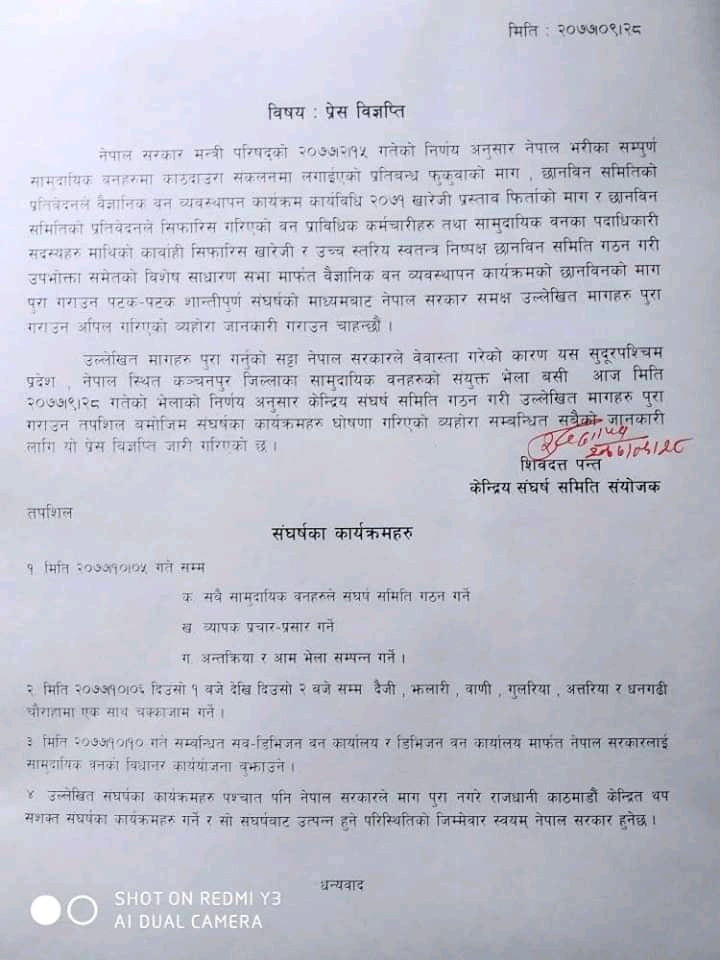 मंगलबार कञ्चनपुरका सामुदायिक वनहरुको संयुक्त भेलाले सो समिति गठन गरि काठदाउरा संकलनमा लगाइएको प्रतिबन्ध फुकुवाको माग गर्दै आन्दोलनका कार्यक्रमहरु सार्वजनिक गरेको छ ।
