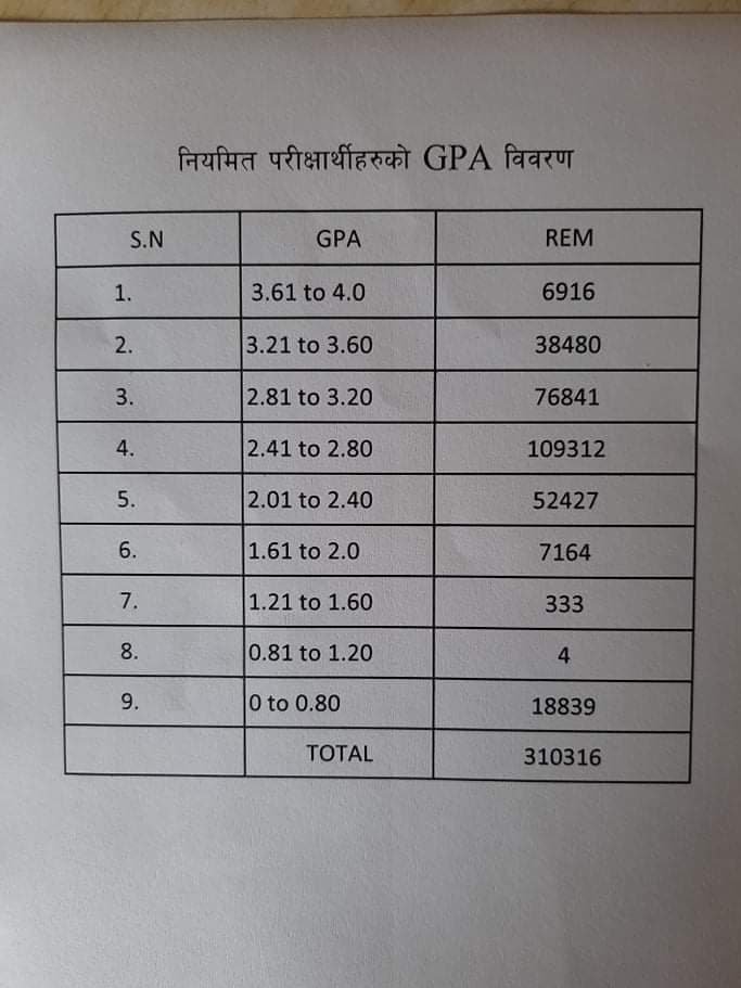 कक्षा १२ को सोमबार प्रकाशित नतिजाअनुसार नियमिततर्फ सहभागी ३ लाख १० हजार ३१६ परीक्षार्थीको जीपीए विवरण प्राप्त भएको छ । नतिजाअनुसार ३.६१ देखि ४ जीपीए ल्याउनेको संख्या ६९१६ जना रहेको छ भने ३.२१ देखि ३.६० जीपीए ल्याउने परीक्षार्थीको संख्या ३८ हजार ४८० जना रहेको छ यस्तै २.८१ देखि ३.२० जीपीए ल्याउनेको संख्या १ लाख ९ हजार ३१२ जना रहेको छ ।