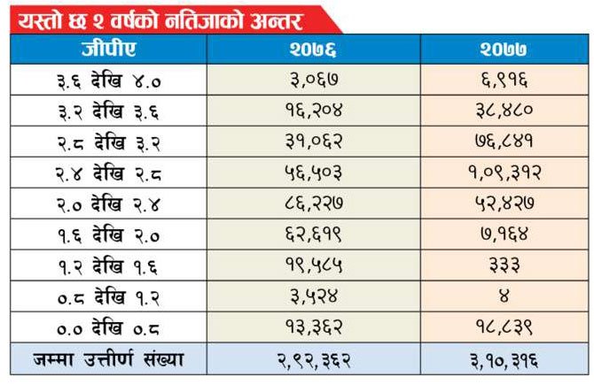 गत वर्षहरुको नतिजामा मध्यम समूहको जीपीए ल्याउने विद्यार्थी सबैभन्दा बढी हुन्थे । यो वर्षको सोमबार प्रकाशित नतिजामा मध्यमभन्दा माथिल्लोस्तरको जीपीए ल्याउने विद्यार्थीको संख्या अत्यधिक छ । गत वर्ष ४ जीपीए ल्याउने विद्यार्थीको संख्या शून्य थियो भने यो वर्ष ४० जनाभन्दा बढीले ४ जीपीए प्राप्त गरेको बोर्डले जनाएको छ ।