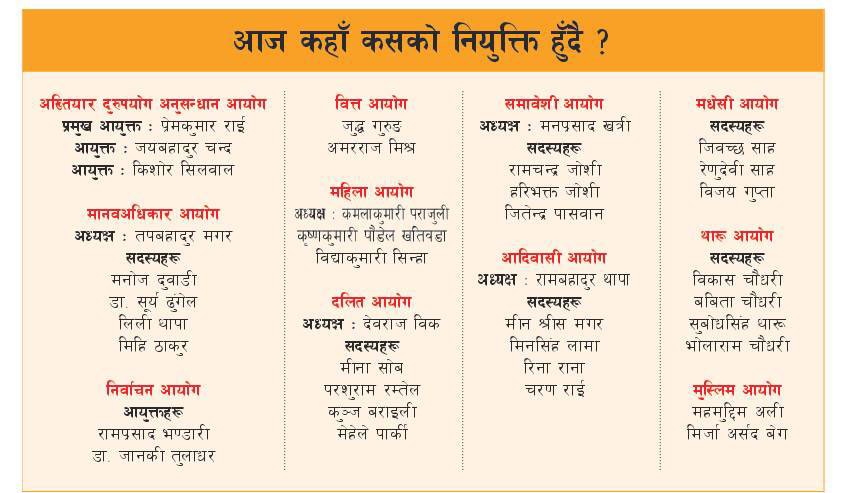 काठमाडौं – लामो समयदेखिको अन्योल चिर्दै बुधबार अधिकांश संवैधानिक आयोगले पूर्णता पाउने भएका छन् । यसअघि संवैधानिक परिषद्ले अख्तियार दुरुपयोग अनुसन्धान आयोगका प्रमुख आयुक्त, राष्ट्रिय मानव अधिकार आयोगका अध्यक्ष, समावेशी आयोगका अध्यक्षलगायत संवैधानिक निकायका अध्यक्षसहितका पदाधिकारी गरी ४५ जनाको नाम नियुक्तिका लागि सिफारिस गरेको थियो ।