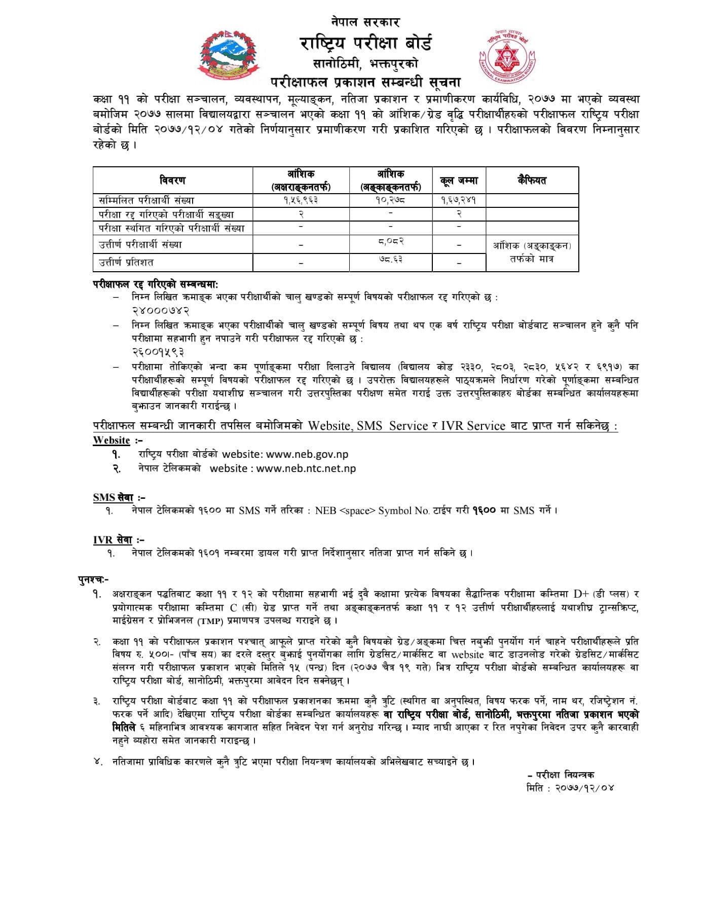 कक्षा ११ को आंशिकर ग्रेड वृद्धि परीक्षार्थीहरुको परीक्षाफल प्रकाशित गरिएको बोर्डले जनाएको हो। बोर्डका अनुसार परीक्षामा सम्मिलित परीक्षार्थीमध्य ७८.६३ प्रतिशत विद्यार्थी उतीर्ण भएका छन्। परीक्षामा १ लाख ६७ हजार २४१ जना परीक्षार्थी सामेल भएका थिए ।
