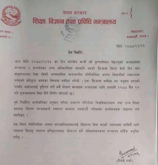 शुक्रबारदेखि काठमाडौं उपत्यकासहित देशका विभिन्न स्थानमा वायु प्रदूषण निकै बढेको छ । जल तथा मौसमविद्का अनुसार लामो समयको खडेरीले हावा सुख्खा भएको छ र, हावाले पानी पार्ने बादलको साटो धुलो र धुँवा लिएर आएको छ । यसका साथै डढेलोका घटना बढेकाले वायु प्रदूषित भएको छ । बैठकमा शिक्षा सचिव रामप्रसाद थपलिया, विज्ञान सचिव डा. सञ्जय शर्मा, मन्त्रालयका प्रवक्ता एवं सहसचिव दीपक शर्मा, सहसचिव डा.हरि लम्साल, शिक्षा, तथा मानव श्रोत विकास केन्द्रका महानिर्देशक वैकुष्ठ अर्याल लगायतको उपस्थिति थियो । बैठक अघि मन्त्री श्रेष्ठले प्रधानमन्त्री केपी शर्मा ओलीसँग परामर्श गर्नुभएको थियो ।