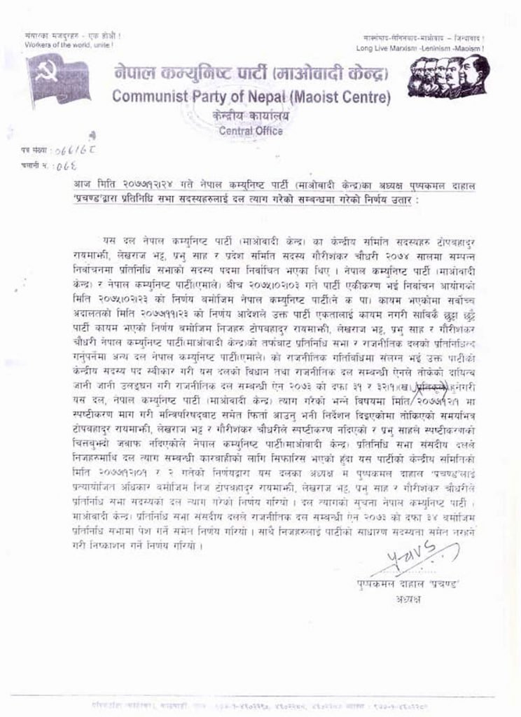 ‘दल त्यागको सूचना नेपाल कम्युनिस्ट पार्टी (माओवदी केन्द्र) प्रतिनिधिसभा संसदीय दलले राजनीतिक दलसम्बन्धी ऐन २०७३ को दफा ३४ बमोजिम प्रतिनिधिसभामा पेश गर्नेसमेत निर्णय गरियो’ अध्यक्ष प्रचण्डले जारी गरेको सूचनामा भनिएको छ ।