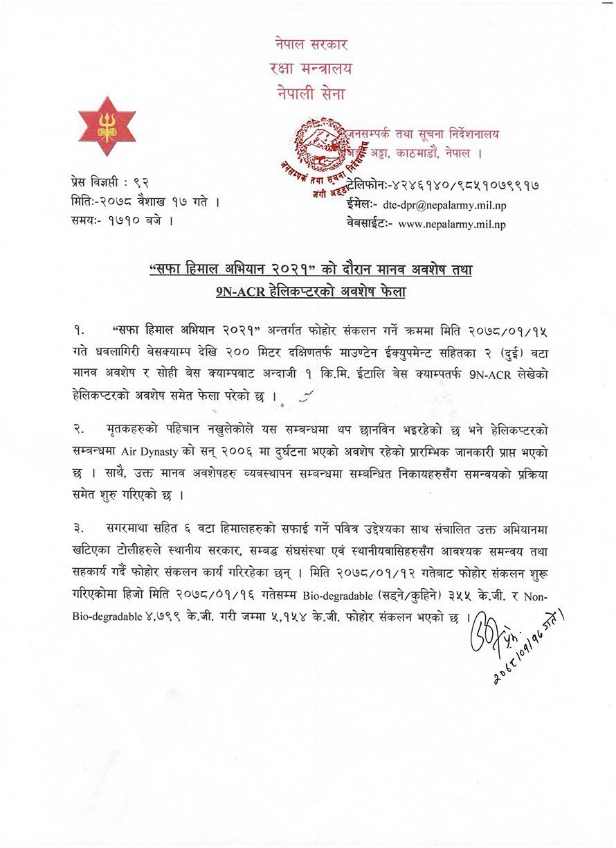 काठमाडौं –  नेपाली सेनाले हिमाल सफाईको क्रममा १५ वर्ष अघि हराइ रहेको हेलिकप्टर र मानव अवशेष भेटिएको बताएको छ । सेनाले आज एक प्रेस विज्ञप्ति जारी गर्दै सफा हिमाल अभियान २०२१ को दौरानमा मानव अवशेष तथा हेलिकप्टरको अवशेष फेला परेको बताएको हो । हिजो धबलागिरी बेसक्याम्प देखि २०० मिटर दक्षिणतर्फ माउण्टेन ईक्युपमेन्ट सहितका दुई वटा मानव अवशेष र सोही बेस क्याम्पबाट अन्दाजी १ किमी ईटालि वेस क्याम्पतर्फ ९ एन ए सी आर लेखेको हेलिकप्टरको अवशेष समेत समेत फेला परेको सेनाले बताएको छ । मृतकहरुको पहिचान नखुलेकाले यस सम्बन्धमा थप छानविन भइरहेको सेनाले जारी गरेको प्रेस विज्ञप्तिमा उल्लेख छ ।