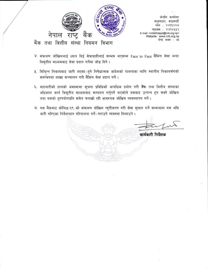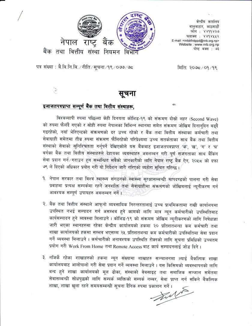 निर्देशनमा कार्यालयमा उपस्थित नभइ कार्य सम्पादन गर्न नसकिने कामका लागि मात्र कर्मचारी बोलाएर काम गर्न भनिएको छ । निषेधाज्ञा जारी भएको स्थानमा केन्द्रिय कार्यालयको हकमा २० प्रतिशतभन्दा कम कर्मचारी र शाखा कार्यालयको हकमा २५ प्रतिशतभन्दा कम कर्मचारी राखेर काम सुचारु गर्न राष्ट्र बैङ्कले भनेको छ । प्रविधिको उच्चतम प्रयोग गर्दै वर्क फ्रम होमलाई जोड दिन पनि बैङ्क तथा वित्तीय संस्थालाई भनेको छ । फेस टु फेस बैंकिङ सेवाभन्दा विद्युतीय माध्यमबाट सेवा प्रदान गर्न केन्द्रिय बैङ्कको निर्देशन छ ।