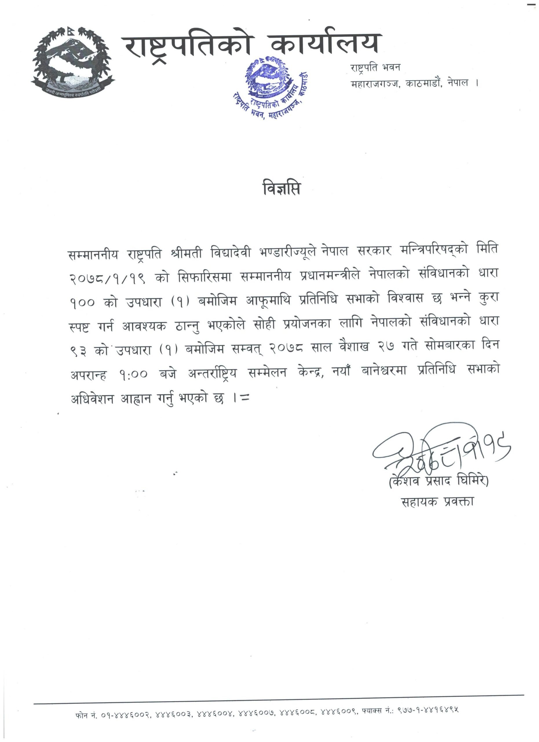 काठमाडौं – राष्ट्रपति विद्यादेवी भण्डारीले यही बैशाख २७ गतेका लागि संसदको अधिवेशन बोलाउनु भएको छ । प्रधानमन्त्री केपी शर्मा ओलीले विश्वासको मत लिनका लागि संसदको बैठक डाक्न सिफारिस गरे अनुसार उहाँले सो अधिवेशन आव्हान गर्नु भएको राष्ट्रपति कार्यालयले जनाएको छ ।