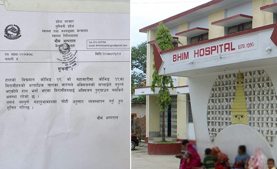 रुपन्देही – भैरहवाको भीम अस्पतालले कोरोना संक्रमितहरुलाई अक्सिजन पु¥याउन नसकिने बताएको छ । अस्पताल प्रशासनले शुक्रबार दिउँसो सूचना निकालेर संक्रमितको अत्यधिक चाप भएकाले भर्ना भएका बिरामीलाई अक्सिजन पु¥याउन नसकिने अवस्था आएको बताएको हो । बिरामीका आफन्तलाई अक्सिजनको आफैं जोहो गर्न पनि अस्पतालले आग्रह गरेको छ