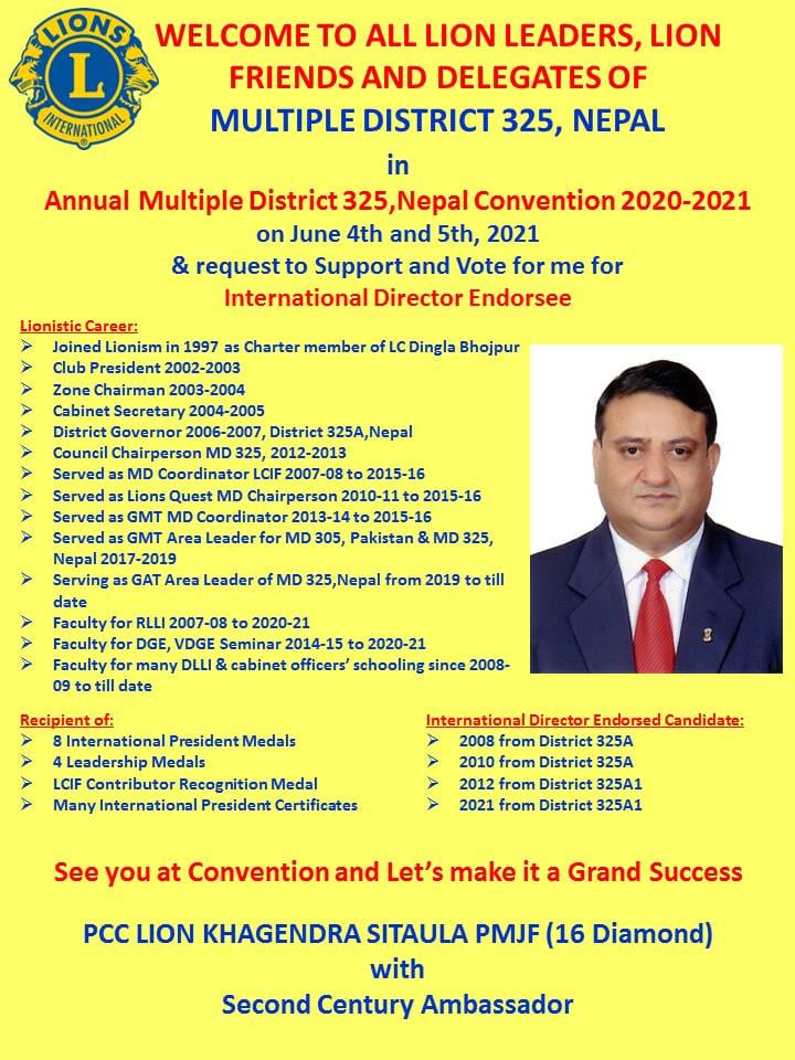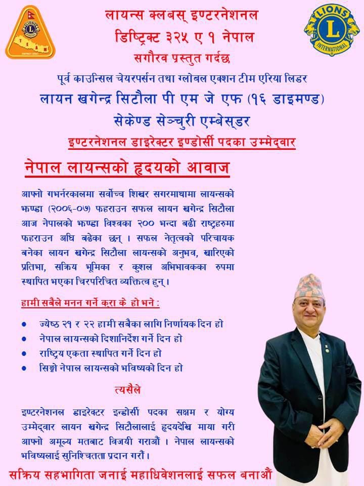 काठमाडौँ – आगामी जेठ २१ र २२ गते हुने लायन्स क्लब्स इन्टरनेशनल डिष्ट्रिक्ट ३२५ मल्टिपल कन्भेन्सनका लागि इन्टरनेशनल डाइरेक्टरमा लायन खगेन्द्र सिटौलाले उम्मेद्वारी दर्ता गरेका छन् ।