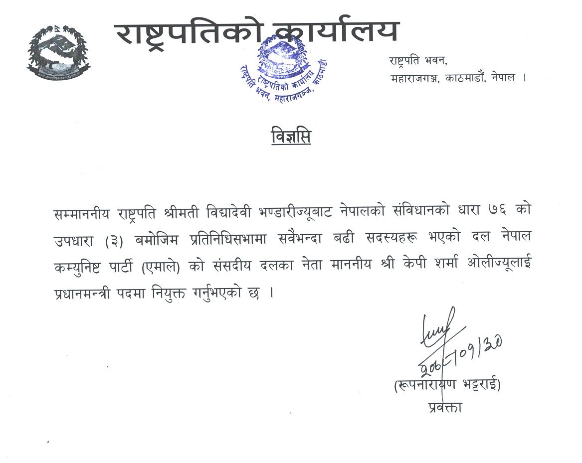 राष्ट्रपतिले ओलीलाई संविधानको धारा ७६ को उपधारा ३ अनुसार प्रधानमन्त्री नियुक्त गर्नुभएको हो ।