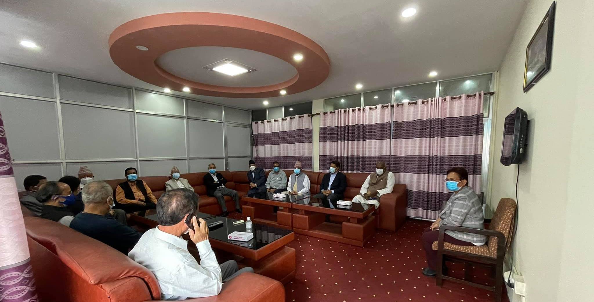 शीतल निवास पुगेका सबैलाई राष्ट्रपतिले भेटिनन् । उनले आफू रहने बैठक कक्षमा आठ जना मात्रै आउन आग्रह गरेकी थिइन् । कांग्रेस सभापति देउवा, माओवादी केन्द्रका अध्यक्ष पुष्पकमल दाहाल, एमाले नेता माधव नेपाल, कांग्रेसका वरिष्ठ नेता रामचन्द्र पौडेल, जसपाका अध्यक्ष उपेन्द्र यादव, माओवादी केन्द्रका उपाध्यक्ष नारायणकाजी श्रेष्ठ, जसपाका नेता महेन्द्रराय यादव, राष्ट्रिय जनमोर्चाकी सांसद दुर्गा पौडेल र कानुनी परामर्शका लागि भन्दै कानुन व्यवसायीसमेत रहेकी कांग्रेस संसदीय दलकी सचेतक पुष्पा भुसाल मात्रै राष्ट्रपतिसँगको भेटमा सहभागी थिए । यो समाचारकान्तिपुर दैनिकमा छ ।