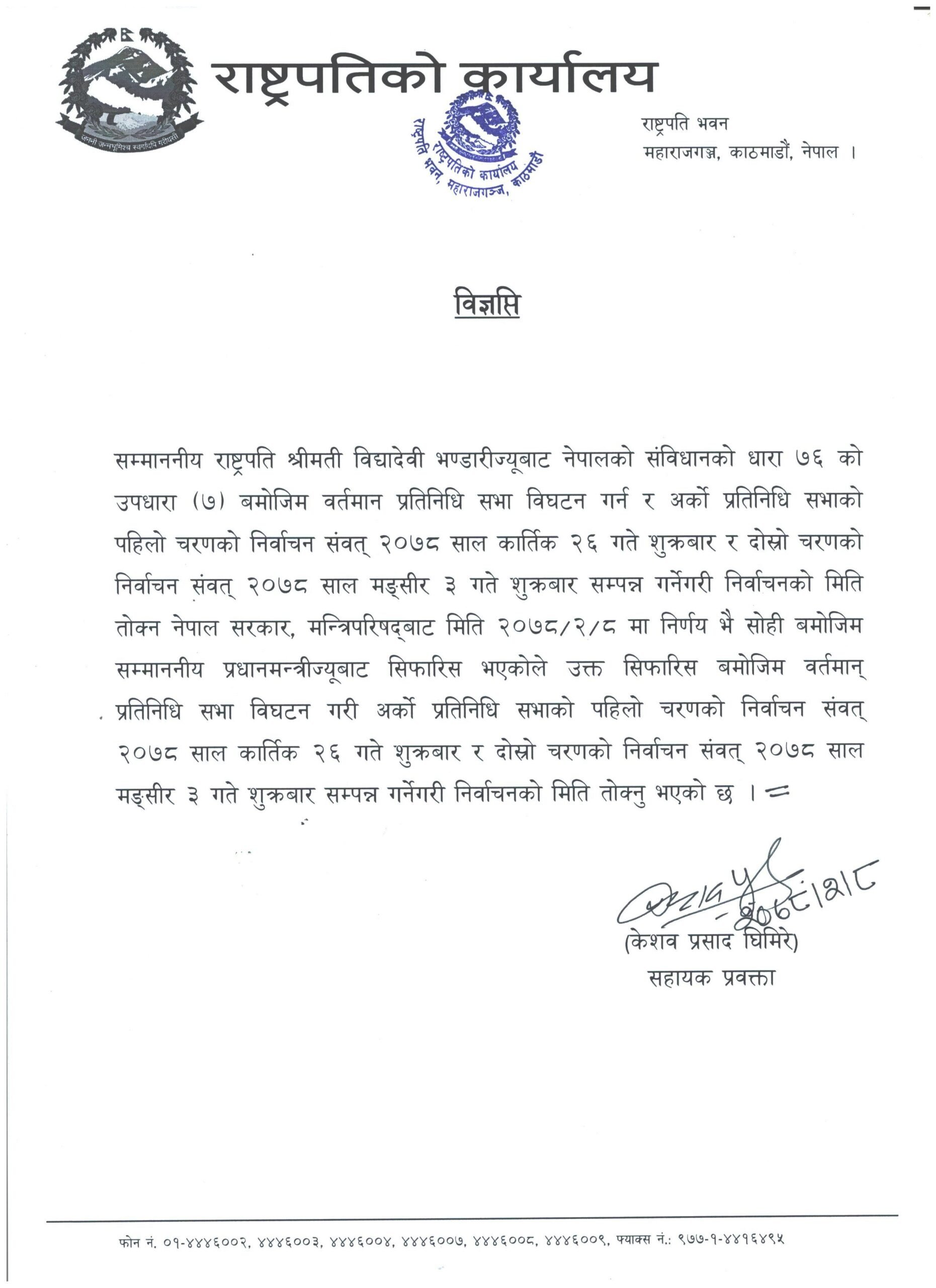मन्त्रिपरिषदको सिफारिसमा शनिबार बिहान राष्ट्रपतिले प्रतिनिधि सभा विघटन गर्दै अर्को प्रतिनिधि सभाको पहिलो चरणको निर्वाचन २०७८ साल कार्तिक २६ गते शुक्रबार र दोस्रो चरणको निर्वाचन मङ्सीर ३ गते शुक्रबार सम्पन्न गर्नेगरी निर्वाचनको मिति तोक्नुभएको छ ।