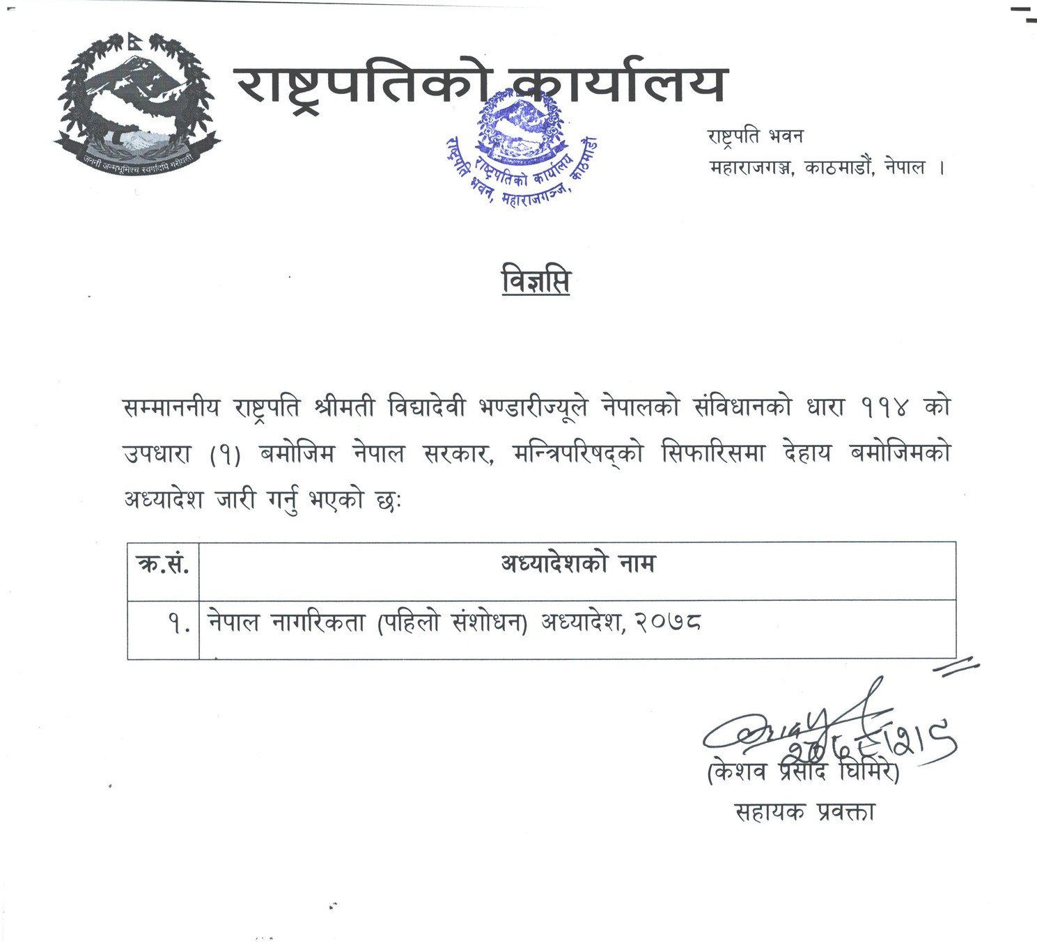 काठमाडौं – राष्ट्रपति विद्यादेवी भण्डारीले नागरिकतासम्बन्धी अध्यादेश जारी गर्नुभएको छ । आइतबार राष्ट्रपति भण्डारीले नेपाल नागरिकता (पहिलो संशोधन) अध्यादेश २०७८ जारी गर्नुभएको हो । सरकारको सिफारिसमा संविधानको धारा ११४ को उपधारा १ बमोजिम अध्यादेश जारी भएको राष्ट्रपति कार्यालयले जारी गरेको विज्ञप्तिमा उल्लेख छ ।