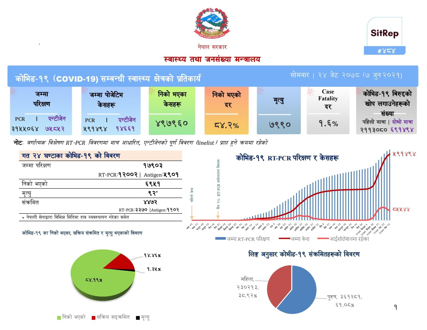 काठमाडौं – पछिल्लो २४ घण्टामा ४४७२ जनामा कोरोना भाइरस संक्रमण पुष्टि भएको छ । स्वास्थ्य तथा जनसंख्या मन्त्रालयका अनुसार १२ हजार २ पीसीआर परीक्षणमा ३३७० र ५,९०१ एन्टिजेन परीक्षणमा १,१०२ गरी कुल १७ हजार ९०३ परीक्षणमा ४,४७२ जनामा संक्रमण पुष्टि भएको हो । स्वास्थ्य तथा जनसंख्या मन्त्रालयका अनुसार पछिल्लो २४ घण्टामा ६९५१ जना संक्रमण मुक्त भएका छन् ।पछिल्लो समय कोरोना संक्रमित भन्दा निको हुने दर धेरै हुँदै आएको सन्दर्भमा सोमबार पनि सोही तथ्यांक आएको छ । हालसम्म कोरोना निको हुनेको कुल संख्या ४ लाख ९७ हजार ९६० पुगेको छ । पछिल्लो २४ घण्टामा ९२ जनाले ज्यान गुमाएका छन् ।