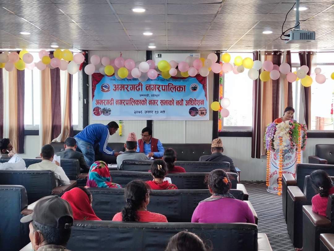 “कृषि शिक्षा स्वास्थ्य पर्यटन र पुर्वाधार! अमरगढी स्मार्ट सिटी निर्माणकाे आधार!!” भन्ने नाराका साथ सम्पन्न नगर सभामा प्रस्तावित कार्यक्रम हेर्दा अत्यन्तै आकर्षक र लाेभलाग्दा रहेका छन। अमरगढी नगरपालिका लाई स्मार्ट सिटिका रुपमा विकास गर्ने लक्ष्यका साथ नगरपालिकाले कार्यक्रमहरू अगाडि सारेका छन् ।